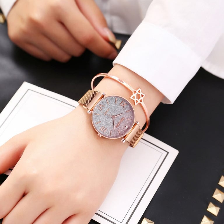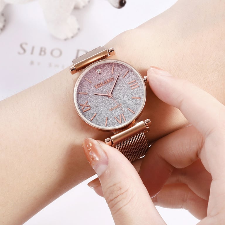 Women's watch with an adjustable metal strap. Dial without numbering in a metal frame.